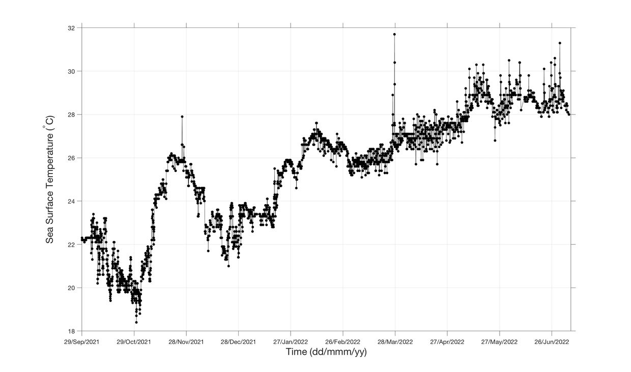 This figure shows the Sea Surface Temperature (SST) measurements collected by Crush along her journey.